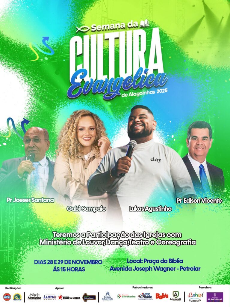 A cidade de Alagoinhas se prepara para viver momentos de profunda fé, adoração e celebração com a realização da Semana da Cultura Evangélica, que acontece nos dias 28 e 29 de novembro, na tradicional Praça da Bíblia, a partir das 15h. O evento reúne igrejas, ministérios, cantores, bandas, lideranças religiosas e toda a comunidade em uma grande festa de louvor e valorização da cultura cristã.